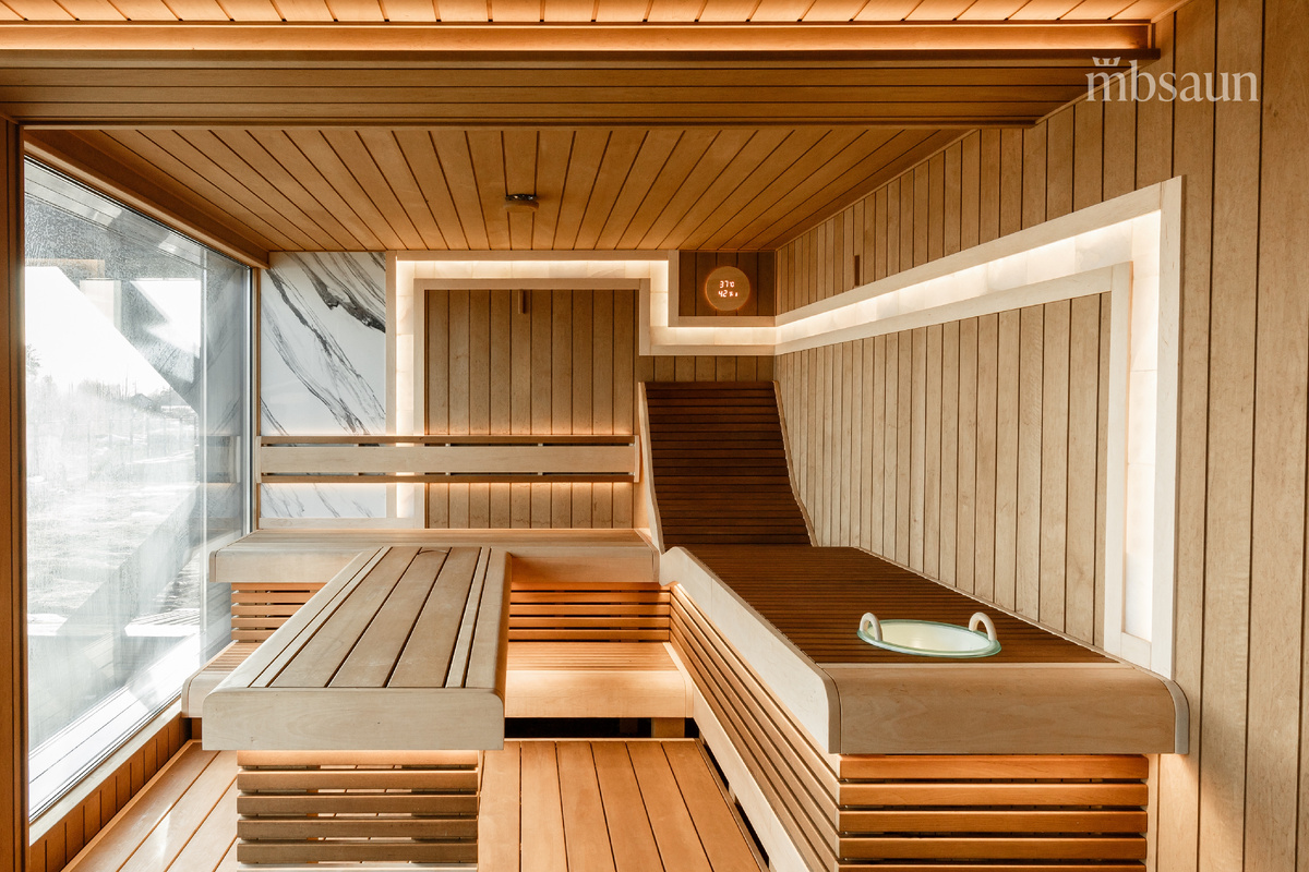Большие размеры помещения 3082ммх5300мм позволили нашим дизайнерам вместить все необходимое: по правой стороне расположился большой анатомический полок, посередине - парильный стол. Слева от входа мы разместили 2 электрические печи.