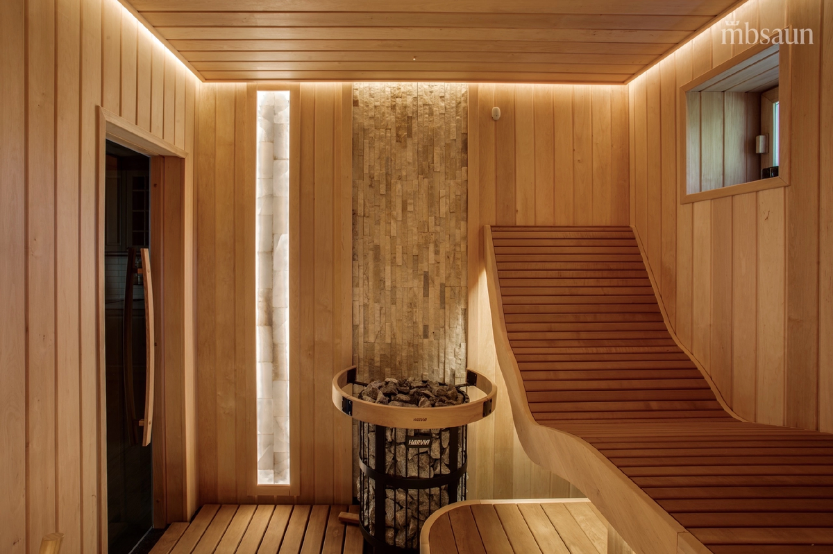 Реализовать воздушную и светлую финскую сауну из прочного и долговечного материала. Создать место для индивидуального парения и закрепить концепт можжевеловым панно.